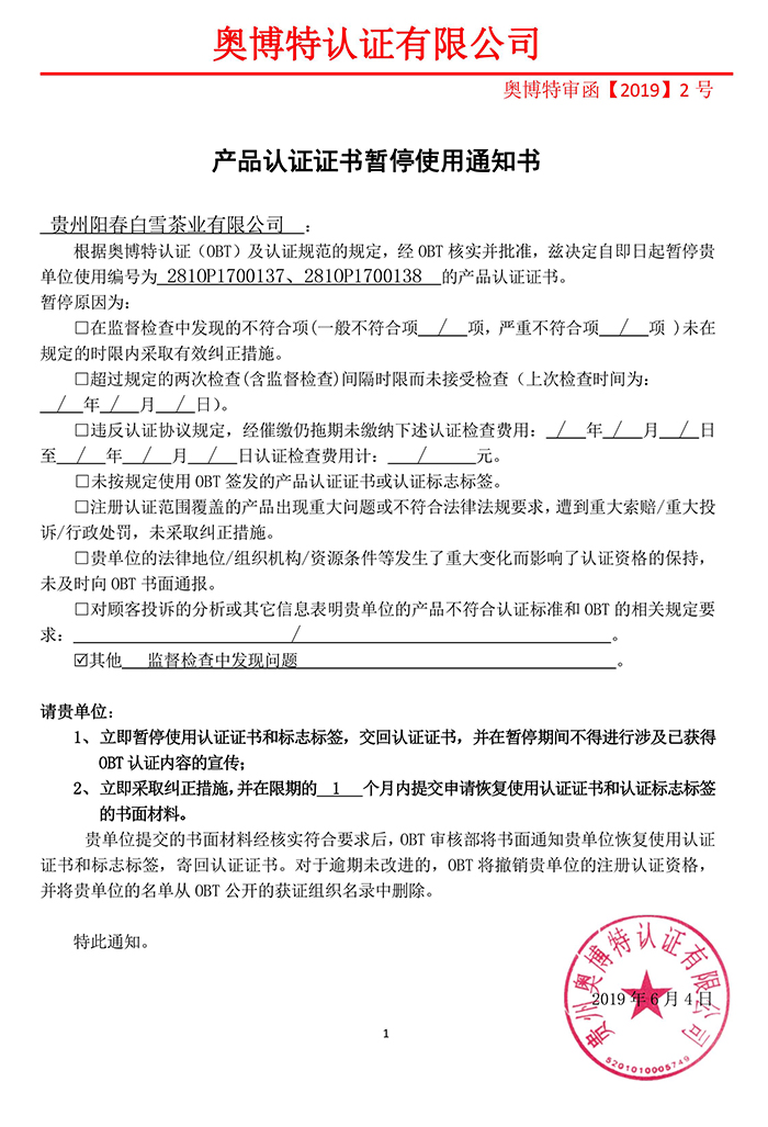 暫停貴州陽春白雪茶業有限公司產品認證證書通知