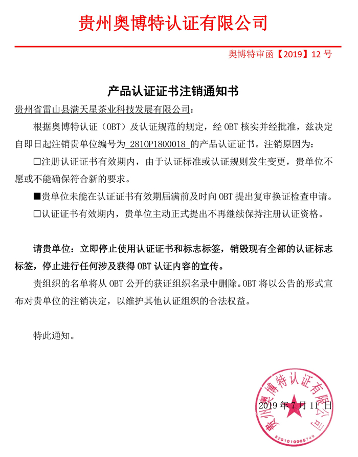 注銷貴州省雷山縣滿天星茶業科技發展有限公司產品認證證書