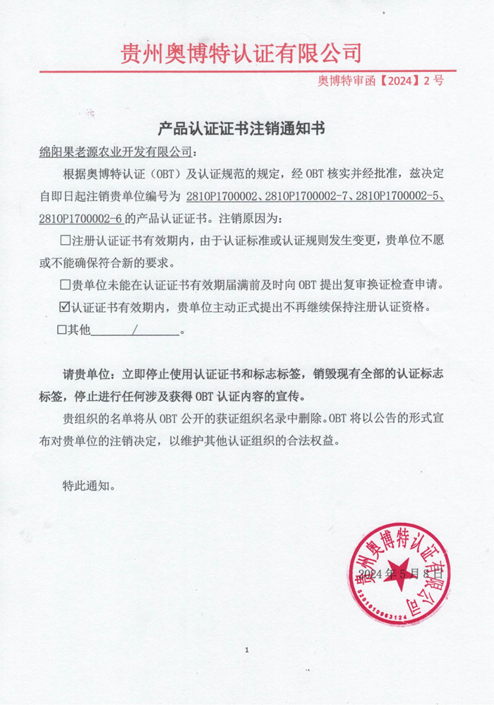 注銷綿陽果老源農(nóng)業(yè)開發(fā)有限公司產(chǎn)品認(rèn)證證書通知